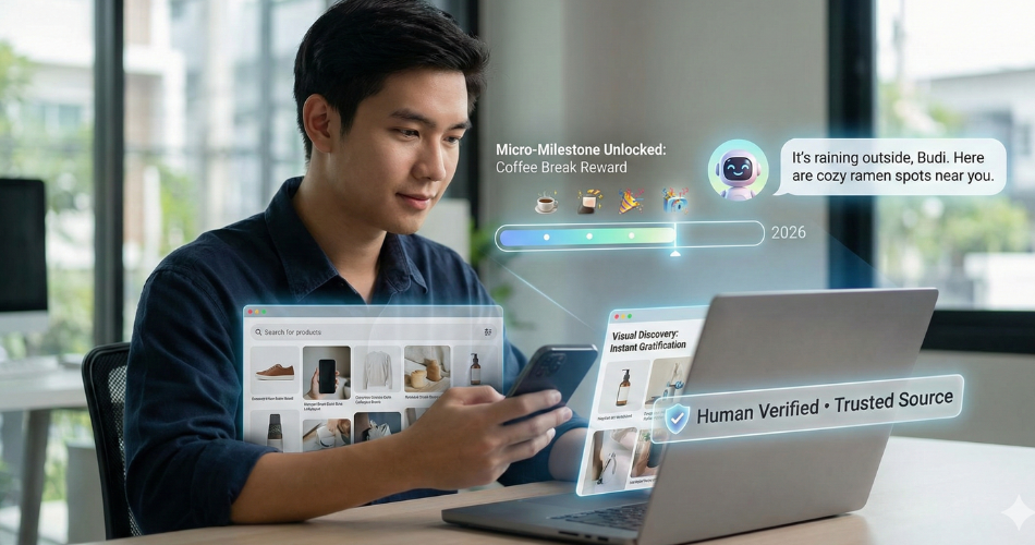 Personalisasi zaman sekarang (2024-2025) itu basi: “Halo Budi, ini rekomendasi sepatu buat lo karena lo pernah liat sepatu.” Itu robot banget. Personalisasi 2026 itu gini: “Halo Budi, keliatannya lo lagi sering browsing tiket ke Jepang dan sekarang lagi hujan deras di lokasi lo. Ini list kedai ramen enak yang bisa delivery ke rumah lo dalam 20 menit buat ngangetin badan.” Liat bedanya? AI harus bisa membaca kombinasi Context, Intent, dan Emotion.